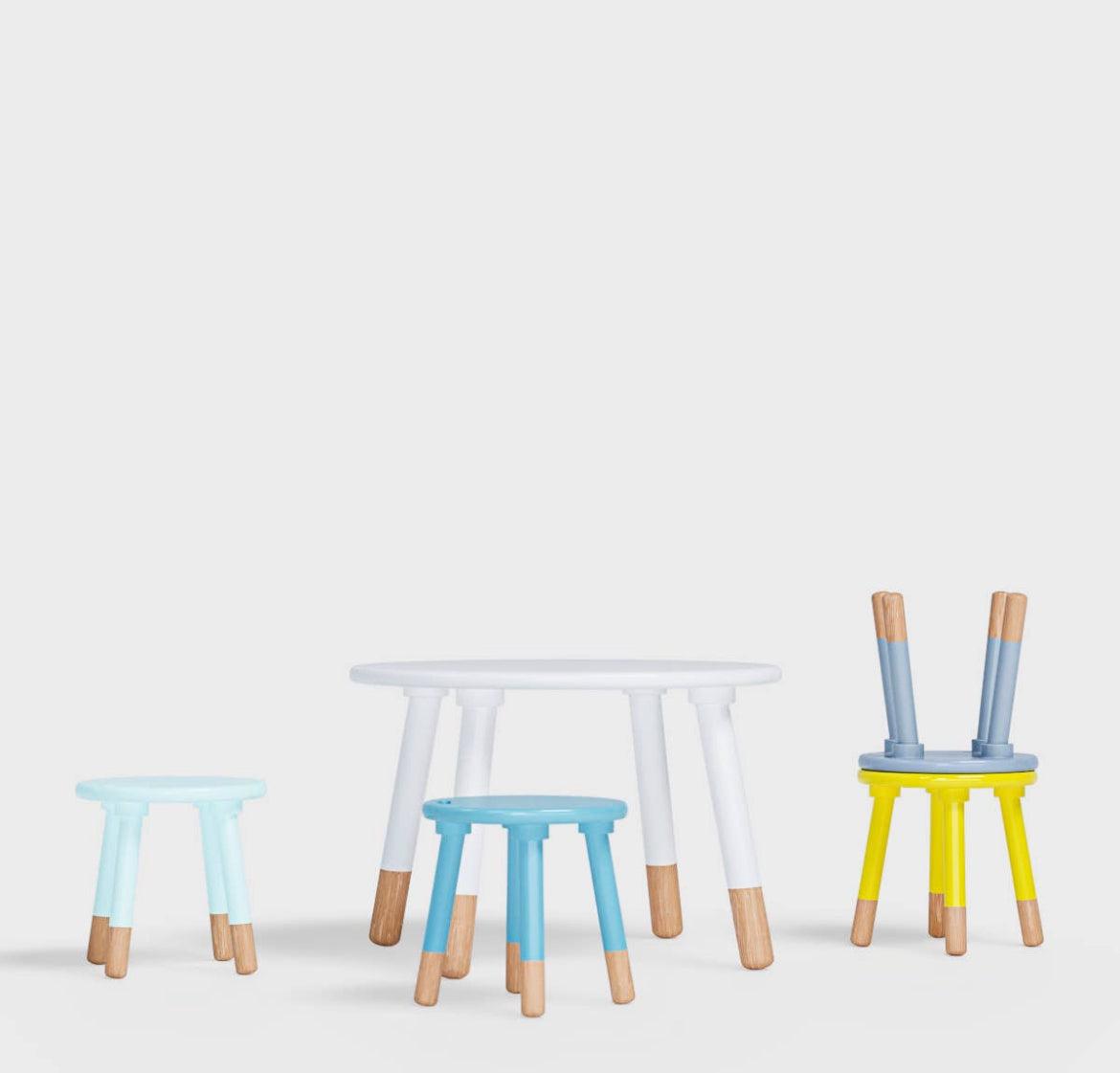 This cute and modern wood table and chair set comes as shown with the white table and 4 chairs colored as shown in sage, mint, sunshine, and ocean!