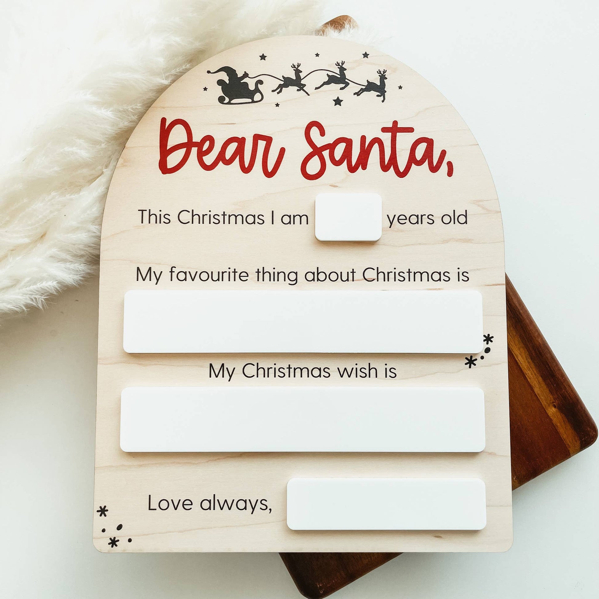 Gorgeously crafted from natural maple wood, this reusable 9" by 11.5" Santa letter sign is perfect for capturing your family's joyful memories each Christmas! Easy to write on with any dry-erase marker (marker not included), the lettering is printed on in permanent ink while the pieces are 3D/raised from the back board.